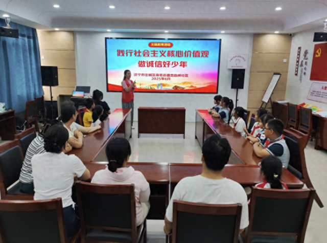 活动现场,社区工作人员以“狼来了”的寓言故事切入,用生动案例讲解“诚信”的内涵与重要性,引导孩子们思考“为什么要讲诚信”“如何做诚信小事”。互动环节中,孩子们踊跃分享生活中遇到的诚信故事,有的讲述主动归还失物的经历,有的畅谈遵守约定的感悟,现场气氛热烈。工作人员还通过播放动画短片、发放诚信主题书签,让抽象的价值观转化为可感知的生活场景。